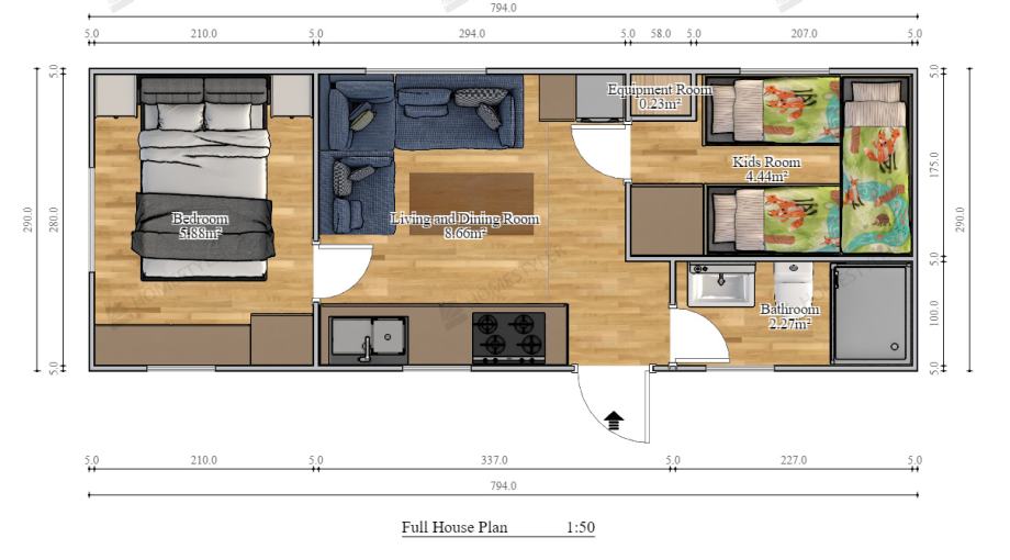 The mobile house is equipped: furniture in bedrooms, furniture in kitchen and bathroom, air condition, refrigerator, gas boiler, gas stove, mosquito nets. All working normally.