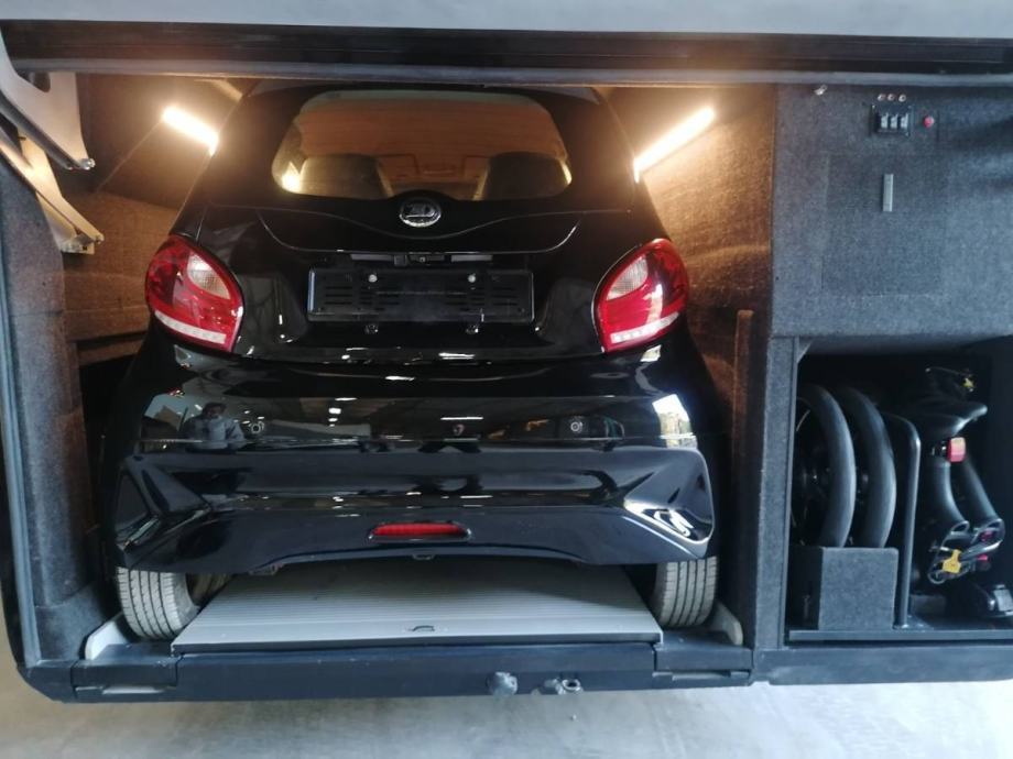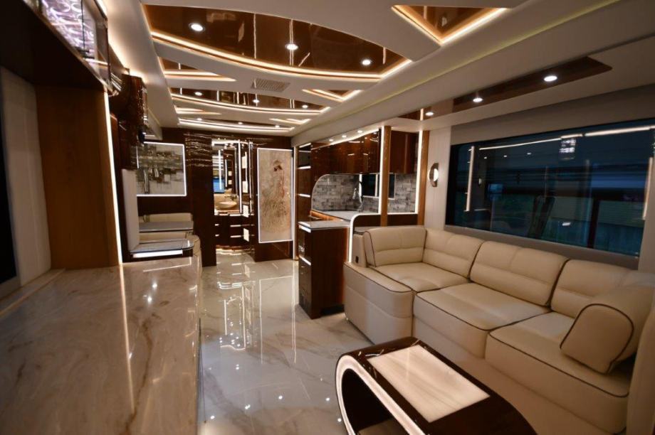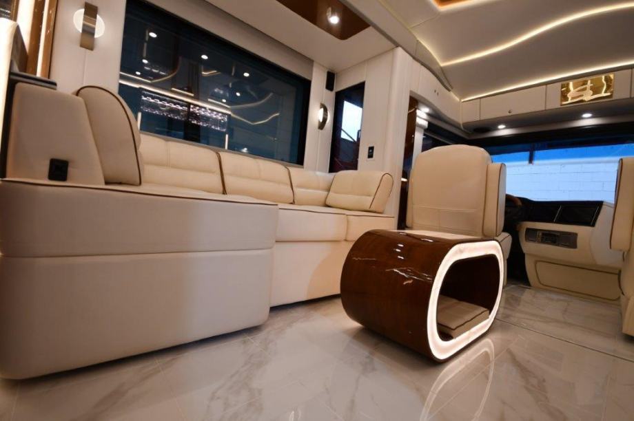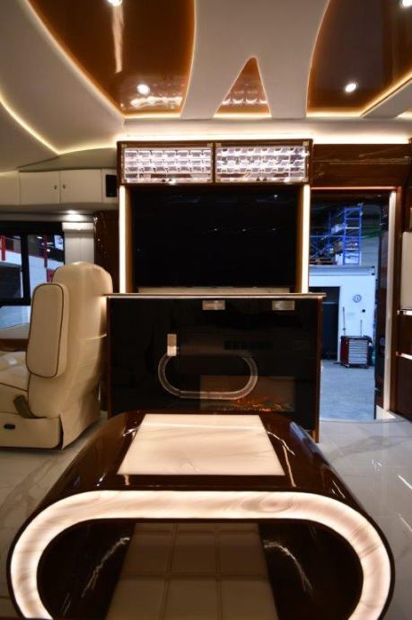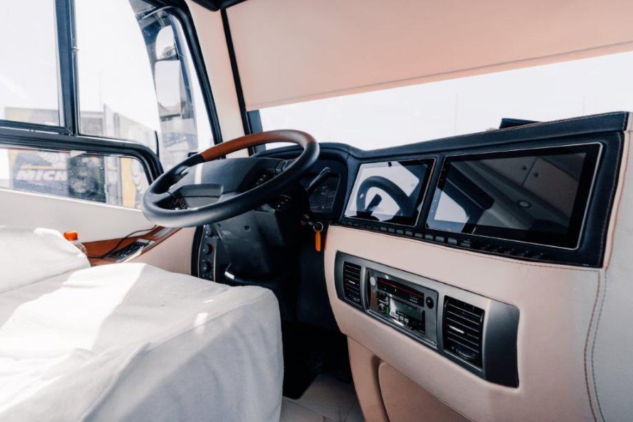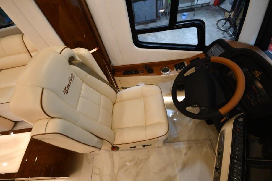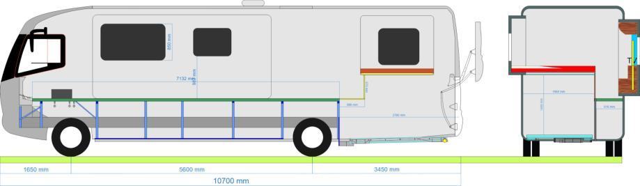 Volvo I-Beam šasija sa 7,7 litrenim Volvo turbodizelskim motorom s powerkitom cca. 305 KS/1400 NM. Allison (pretvarač zakretnog momenta) automatski mjenjač, emisija: Euro 6, 110 Amp. / 3080W alternator, dijagonalni 4-kanalni ABS. Sustav disk kočnica na 4 kotača (zračni). Tempomat, dodatni intarder-kočnica sa sep. hladnjak ulja, prednja osovina: 5'800 kg & stražnja osovina 10'900 kg. Ukupna težina (GVWR): 16.000 kg. Klima za vozača, Gume: 285/70R19,5 Alcoa- "Alubright"- alu felge (6x) Prednja i zadnja osovina sa stabilizatorima. Razno. Kočnica. Prednja i stražnja osovina sa zračnim ovjesom. Spremnik dizela cca. zapremine 300 litara. Potpuno automatski, hidraulički sustav niveliranja s 4 dizalice. Omjer stražnje osovine 3,73 za duže krstarenje autocestom. Ukupna dopuštena težina: 16.000 Kg. Školjka: samonosiva, jednodijelna, bešavna GRP školjka s integriranim čeličnim okvirom. Izolacija od krute PU pjene, vanjske obloge u GFK strani visokog sjaja sa zidovima debljine 68 mm, GRP krov debljine 68 mm s PU izolacijom, pod debljine 70 mm s izolacijom od krute PU pjene (otporan na otapala!) i integrirano podno grijanje (vlastiti krug) . Zaobljeno vjetrobransko staklo autobusa. Svi bočni prozori od zatamnjenog termopan kaljenog stakla, s okvirom koji je nevidljiv izvana. Prednji poklopac s integriranim prednjim svjetlima od prozirnog stakla i svjetlima za maglu. Izvana - zaobljeni poklopci pretinca s plinskim amortizerima i električnim otključavanjem. Prekidač za centralno zaključavanje. Velika stražnja garaža za male automobile (trenutno električno vozilo "Zhidou DS2"), s hidrauličkim otvaranjem stražnjih vrata i padajuće platforme za utovar (daljinsko upravljanje). Uvlačivi klizač za 2-dijelni 'GoCycle' e-bicikl. Potpuno integrirana, ojačana, električna tenda s funkcijom nagiba. Električno uvlačivo vanjsko osvjetljenje s lijeve i desne strane, kao i sprijeda i straga. Quantum prednja kapa. Električno zatvoren radni poklopac spremnika lijevo i desno. Izuzetno široka prednja vrata, s kontrolom koda na dodirnoj ploči / kontrolom pristupa otiskom prsta i električnim motorima za zatvaranje. Prozori s električnim noćnim zatamnjivanjem i zaštitom od komaraca. Ukupno 3 klizna izlaza, hidraulički, sa brtvom na komprimirani zrak i mekim brisačima. Savršeno izolirana ostava na vratima s hidrauličnim prigušivačima i dvostupanjskim električnim bravama. Skrivene i podesive šarke od nehrđajućeg čelika.
