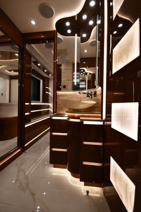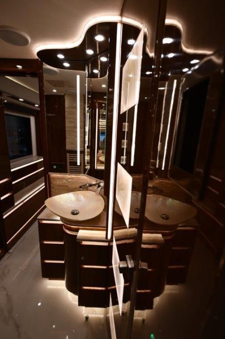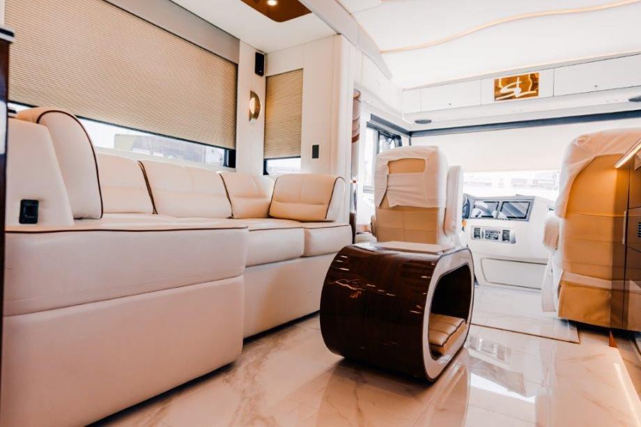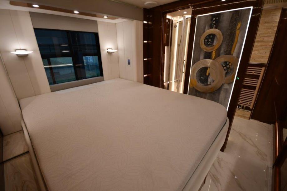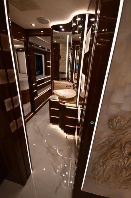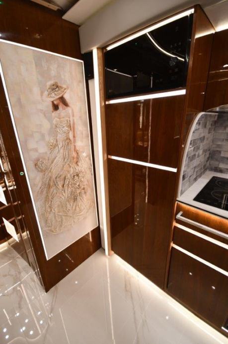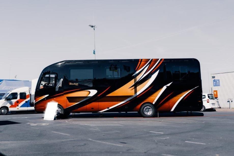 Volvo I-Beam šasija sa 7,7 litrenim Volvo turbodizelskim motorom s powerkitom cca. 305 KS/1400 NM. Allison (pretvarač zakretnog momenta) automatski mjenjač, emisija: Euro 6, 110 Amp. / 3080W alternator, dijagonalni 4-kanalni ABS. Sustav disk kočnica na 4 kotača (zračni). Tempomat, dodatni intarder-kočnica sa sep. hladnjak ulja, prednja osovina: 5'800 kg & stražnja osovina 10'900 kg. Ukupna težina (GVWR): 16.000 kg. Klima za vozača, Gume: 285/70R19,5 Alcoa- "Alubright"- alu felge (6x) Prednja i zadnja osovina sa stabilizatorima. Razno. Kočnica. Prednja i stražnja osovina sa zračnim ovjesom. Spremnik dizela cca. zapremine 300 litara. Potpuno automatski, hidraulički sustav niveliranja s 4 dizalice. Omjer stražnje osovine 3,73 za duže krstarenje autocestom. Ukupna dopuštena težina: 16.000 Kg. Školjka: samonosiva, jednodijelna, bešavna GRP školjka s integriranim čeličnim okvirom. Izolacija od krute PU pjene, vanjske obloge u GFK strani visokog sjaja sa zidovima debljine 68 mm, GRP krov debljine 68 mm s PU izolacijom, pod debljine 70 mm s izolacijom od krute PU pjene (otporan na otapala!) i integrirano podno grijanje (vlastiti krug) . Zaobljeno vjetrobransko staklo autobusa. Svi bočni prozori od zatamnjenog termopan kaljenog stakla, s okvirom koji je nevidljiv izvana. Prednji poklopac s integriranim prednjim svjetlima od prozirnog stakla i svjetlima za maglu. Izvana - zaobljeni poklopci pretinca s plinskim amortizerima i električnim otključavanjem. Prekidač za centralno zaključavanje. Velika stražnja garaža za male automobile (trenutno električno vozilo "Zhidou DS2"), s hidrauličkim otvaranjem stražnjih vrata i padajuće platforme za utovar (daljinsko upravljanje). Uvlačivi klizač za 2-dijelni 'GoCycle' e-bicikl. Potpuno integrirana, ojačana, električna tenda s funkcijom nagiba. Električno uvlačivo vanjsko osvjetljenje s lijeve i desne strane, kao i sprijeda i straga. Quantum prednja kapa. Električno zatvoren radni poklopac spremnika lijevo i desno. Izuzetno široka prednja vrata, s kontrolom koda na dodirnoj ploči / kontrolom pristupa otiskom prsta i električnim motorima za zatvaranje. Prozori s električnim noćnim zatamnjivanjem i zaštitom od komaraca. Ukupno 3 klizna izlaza, hidraulički, sa brtvom na komprimirani zrak i mekim brisačima. Savršeno izolirana ostava na vratima s hidrauličnim prigušivačima i dvostupanjskim električnim bravama. Skrivene i podesive šarke od nehrđajućeg čelika.
