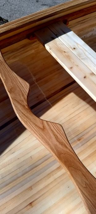 Napravljen je od jelovine sa ukrasima od mahagonija i jasena. Ojacanja i sediste su od hrasta. Drvo je ojacano staklenim platnom sa 3 sloja kvalitetene uv stabilne epoxi smole! Zavrsni prelaz je uradjen u 3 sloja sa dvokomponentnim poliuretanskim lakom! Srafovi koji drze sediste su od prohroma!