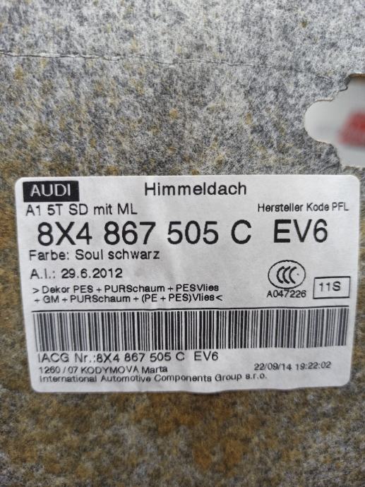 AUDI A1 8X SPORTBACK *** KROVNA CRNA OBLOGA *** 8X4867505C EV6 ***