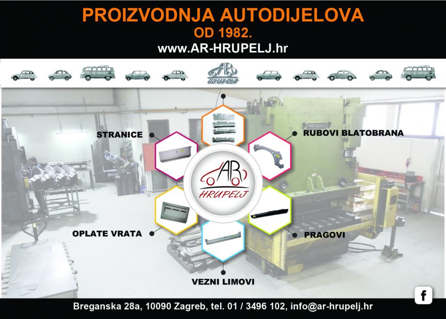 Tvrtka AR HRUPELJ d.o.o. je osnovana 1982. godine i jedina je tvrtka koja PROIZVODI zamjenske karoserijske autodijelove u Hrvatskoj. Proizvodimo i izvozimo dijelove u EU, danskoj tvrtki KLOKKERHOLM, te poljskoj tvrtki POLCAR..