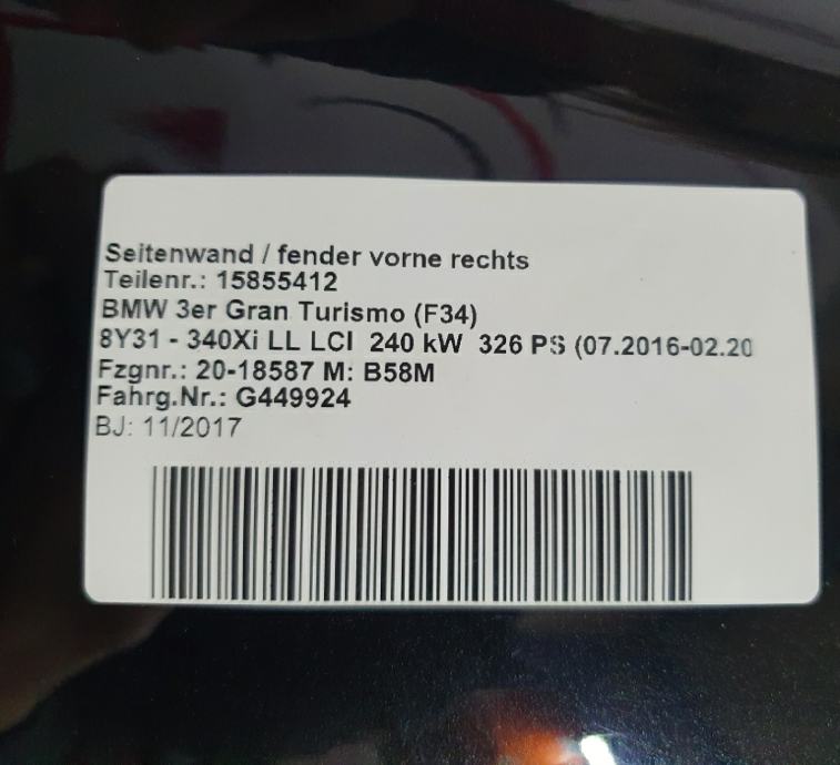 F34 335dX Gran Turismo N57Z Europe N L 1 Side panel, front