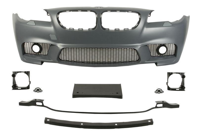 Branik prednji kompletni (sprijeda, M-PAKET, s rešetkama, s otvorima za maglenke, s otvorima za pranje farova, za lakiranje) odgovara na modele: BMW 5 F10, F11 06.13-02.17