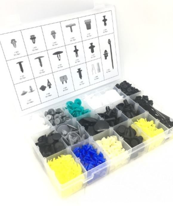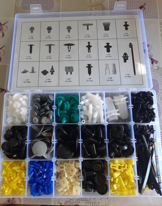 Set sadrži 720 dijelova čepova , spojnica i kopči za razne primjene spajanje limenih, plastičnih dijelova i tapiceriju.