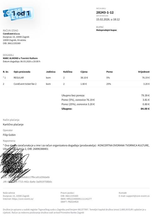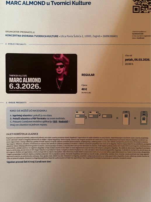 Zbog bolesti prodajem 2 ulaznice za koncert Marc Almonda u Tvornici kulture, 6.3.26.