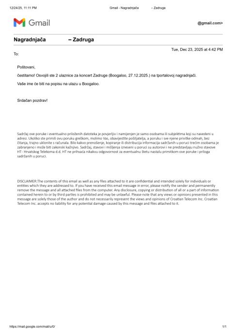 Karte su dobivene na nagradnoj igri - nakon uplate prebacit ću ih na ime kupca.
