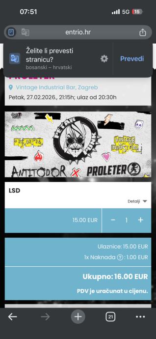 Prodajem 3 karte za koncert Petra Punka koji će se održati 27.2. u Vintageu Industrial Baru zbog nemogućnosti odlaska. Plaćena cijena karti je 48 eura, prodajem 3 za 30 eura. Kontaktirati na mail resetaaar@gmail.com ili na 098 978 1230.