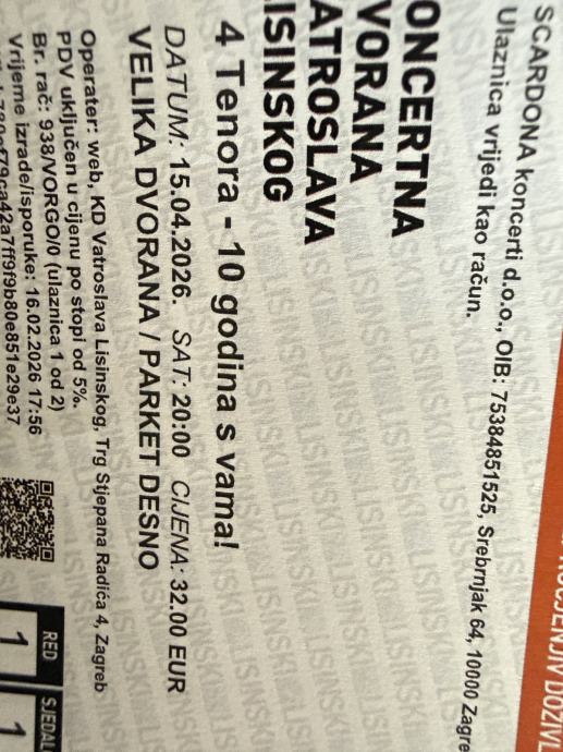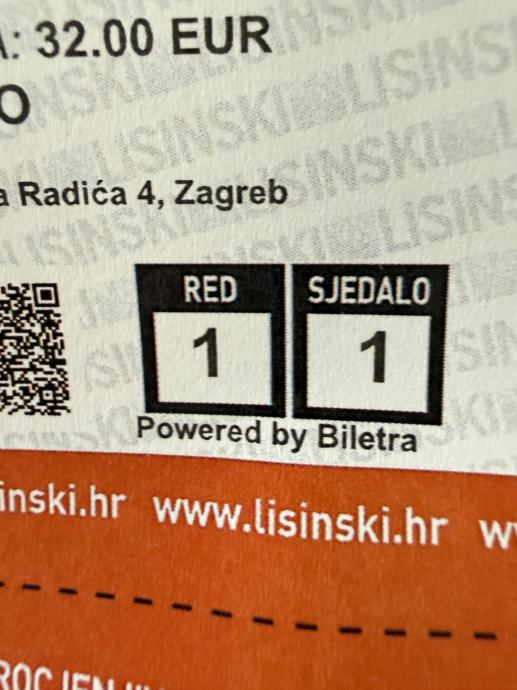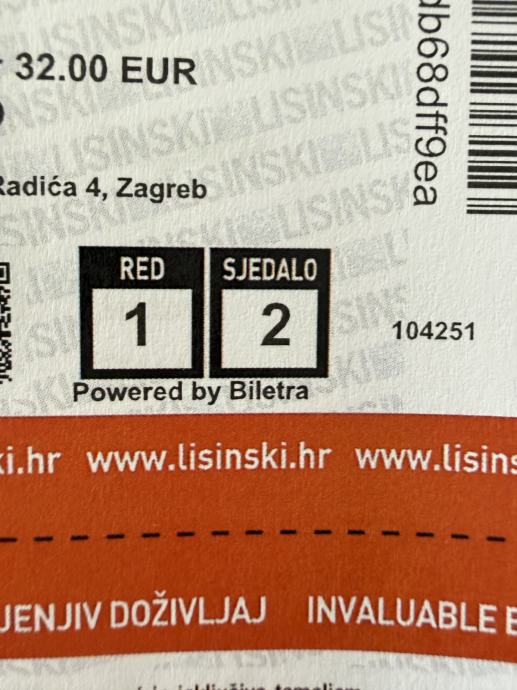 Dvije karte za 15.4 parket desno. Prvi red sjedalo jedan i dva. Prodajem jer zbog nepredviđene operacije ne mogu ići. Plaćene 32€ prodajem za 30 po komadu. Prednost primopredaja Osijek ali može i slanje mailom.