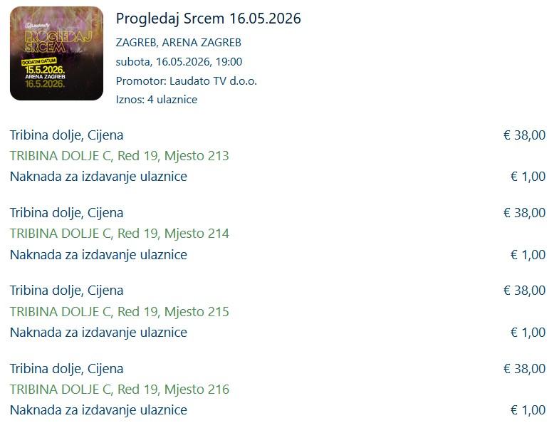 Prodajem 4 ulaznice za koncert Progledaj Srcem u Areni Zagreb, subota 16.5.2026.