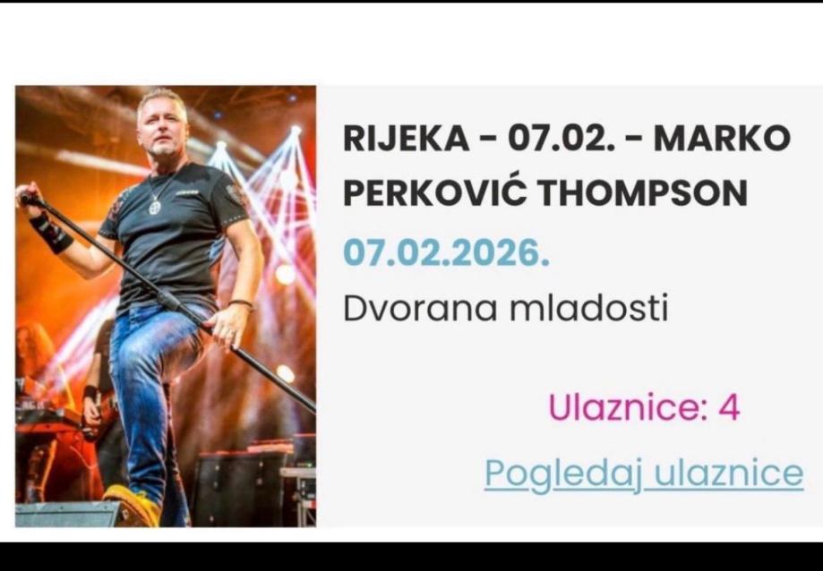 nudim na prodaju 4 ulaznice (stajanje / parter) za koncert Marka Perkovića Thompsona u Rijeci, koji će se održati 07.02.2026.