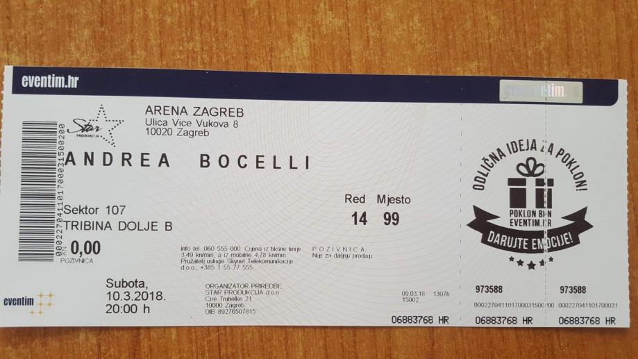 Prodajem ulaznicu za koncert Andree Bocellija, 10.3.2018. Red 14, mjesto 99.
