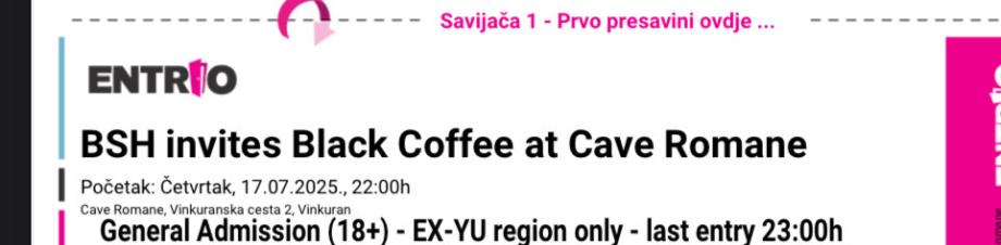 1x karta Ex-Yu za Black Coffee u Cave Romana za 17.07. Razlog prodaje nabavka VIP karte pa je ova viska.