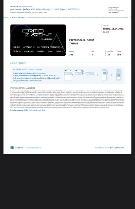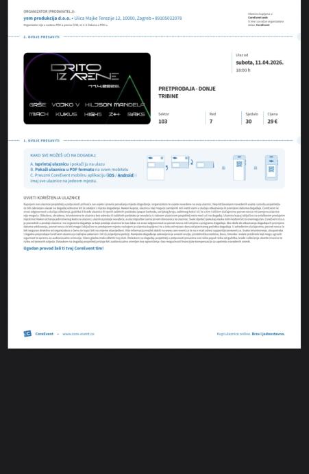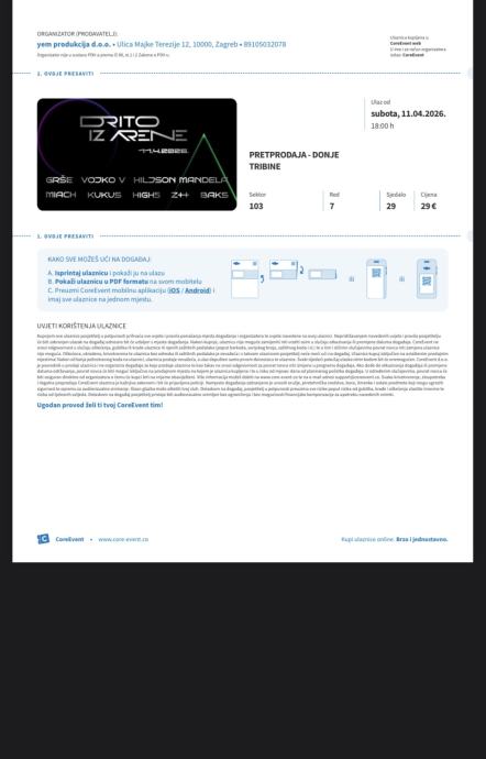 Imam 3 karte za Drito iz Arene 11.4 u Areni Zagreb, sjedala su na tribinama, mogu poslati karte/kartu na mail,