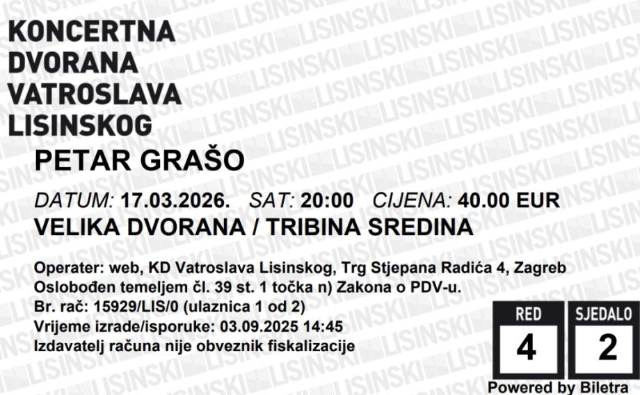 Na prodaju 2 karte za koncert Petra Graše u dvorani Lisinski 17.03., 20h.