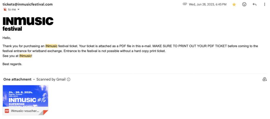 Inmusic festivalska karta za sva 3 dana, kupljena prosle godine kao "super early bird" po cijeni od 72 eura.