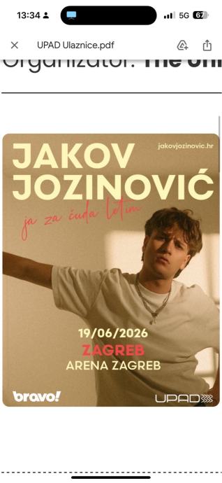 -Prodajem 2 ulaznice za koncert Jakova Jozinovića u Areni Zagreb 19.6.2026.