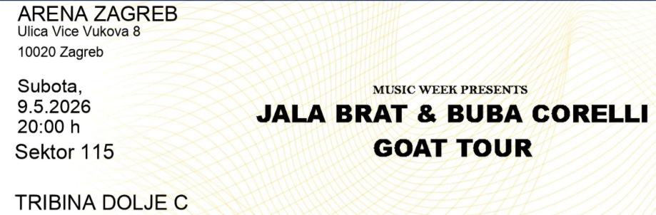 Prodaje se jedna karta za Jalu I Bubu 09.05 u Areni Zg. Karta je za tribinu , i dostupna je kao e ulaznica.