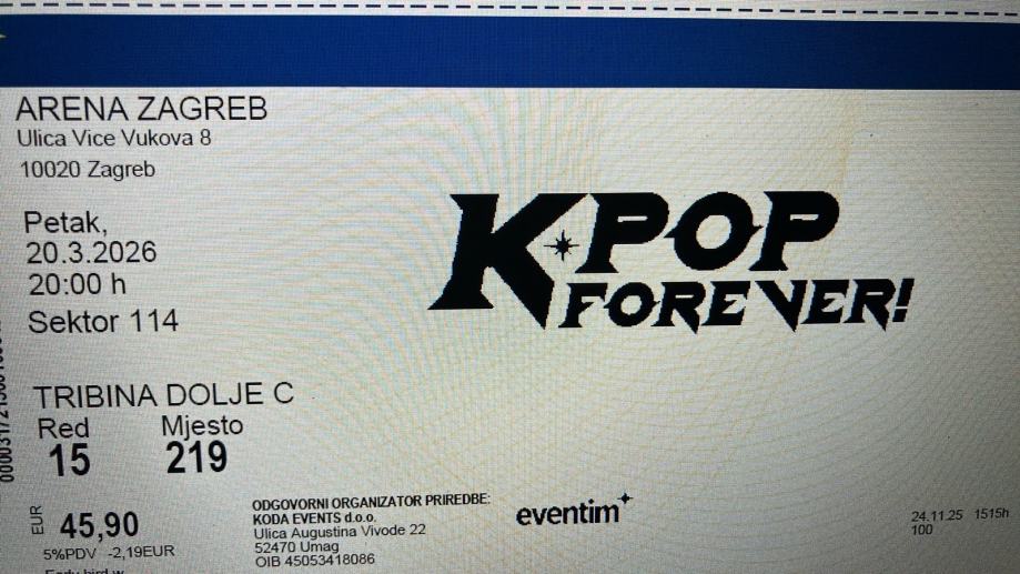 Prodajem kartu za koncert K-pop Forever koji se održava u petak, 20. ožujka 2026. godine u Areni Zagreb. Cijena se odnosi na 2 karte.