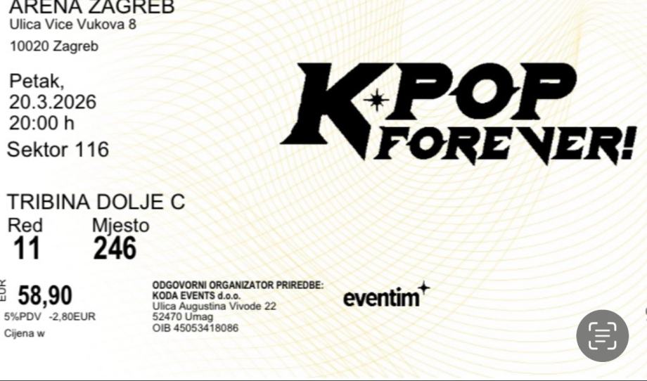 Prodajem dvije karte za koncert K Pop Forever, 20.03.