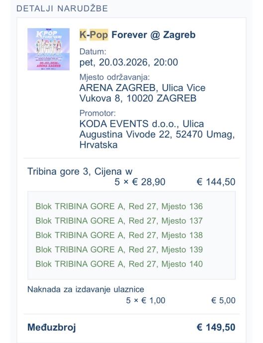 Prodajem ulaznice (5x) za koncert K-POP u Zagrebu 20.3.2026