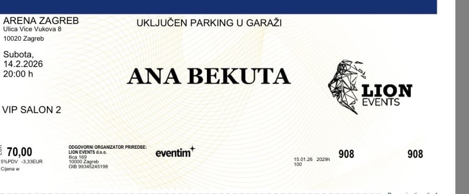 Prodajem 4 karte za koncert Ane Bekute u Areni Zagreb. Koncert je zakazan za subotu, 14.2.2026. godine s početkom u 20:00 sati. Karta je za VIP salon 2, što osigurava odličan pogled i ugodno iskustvo.
