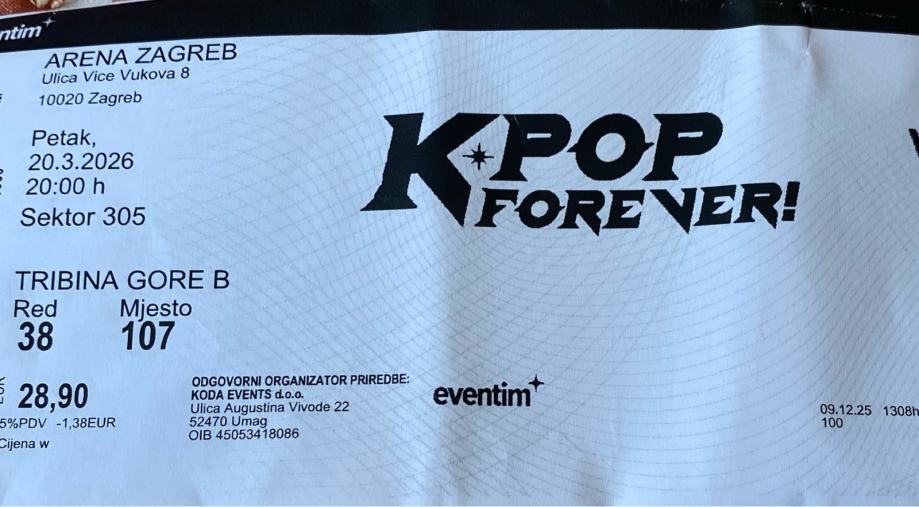 Prodajem dvije ulaznice za koncert u Areni 20.3.2026. 20h za K-Pop forever!!