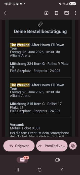 Prodajem dvije karte za koncert The Weeknd - After Hours Til Dawn Tour u Münchenu, u Allianz Areni. Koncert se održava u petak, 26. lipnja 2026. godine, s početkom u 18:30 sati.