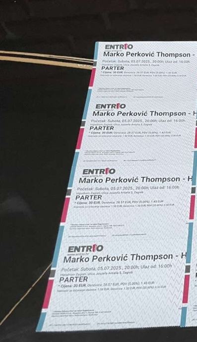Prodajem 7 ulaznica za koncert Thompsona u fizičkom obliku, preuzimanje osobno ili poštom. Kupljene na entrio prodajnom mjestu, moguca provjera bar koda. Cijena karte je 10 EUR po komadu. 095 3918590
