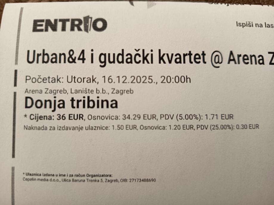 Prodajem dvije karte za koncert Urban&4 i gudački kvartet u Areni Zagreb, za dan 16.12.2025.g. u 20,00 sati (donja tribina)