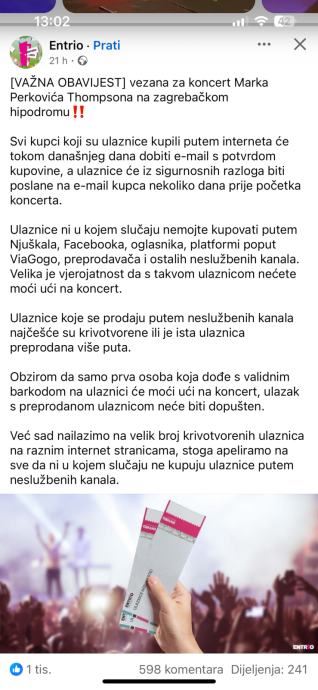 Ulaznice kupljenje za parter preko Entrija moguce je preuzet par dana prije koncerta u prilogu obavjest