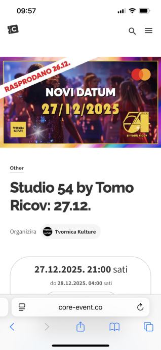 Prodajem 1 kartu za Studio 54 by Tomo Ricov, 27.12.2025. Print karte dajem pri isplati.