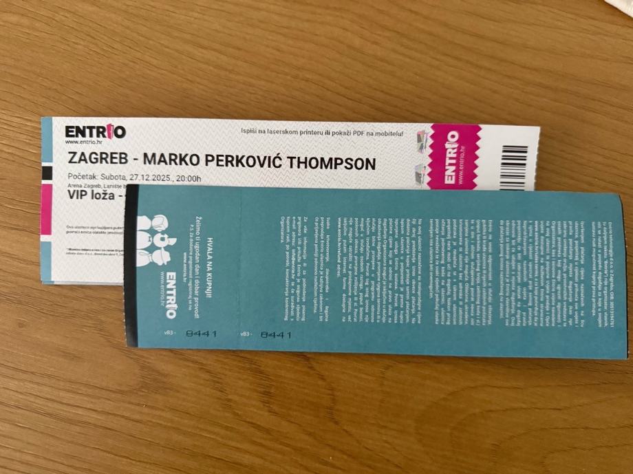 Prodajem ulaznice za koncert Marka Perkovića Thompsona u Areni Zagreb 27.12. - ulaznice su kupljenje na Entriu tako da nije nikakav print, fizičke su. Imam 10 komada.