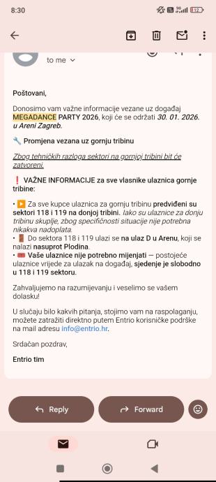 Prodajem 2 karte za Megadance koncert 30.01., gornja tribina, no ulaziti ce se na donju bez nadoplate.