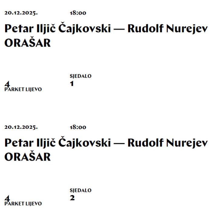 Prodajem 2 karte za balet Orašar, 20. 12. (subota) u 18:00 h, HNK Zagreb.