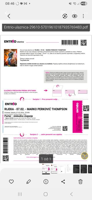 Prodajem 2 karte za Thompsonov koncert 07.02.Parter
