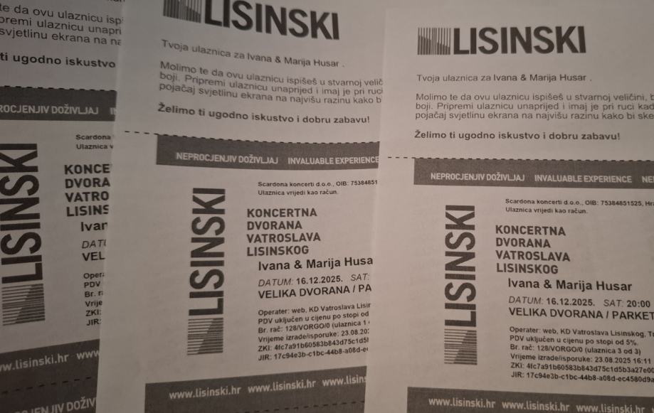 Prodajem 3 karte za koncert Ivane i Marije Husar - Lisinski 16.12
