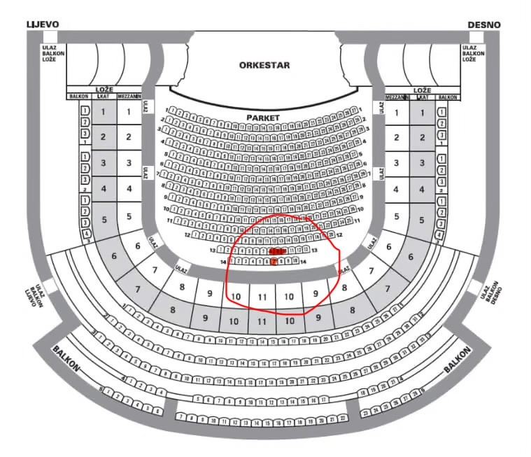 Sjedala: Parket desno - 13. red Sjedalo 8, 9, 10 i 14. Red Sjedalo 7 (vidi sliku)