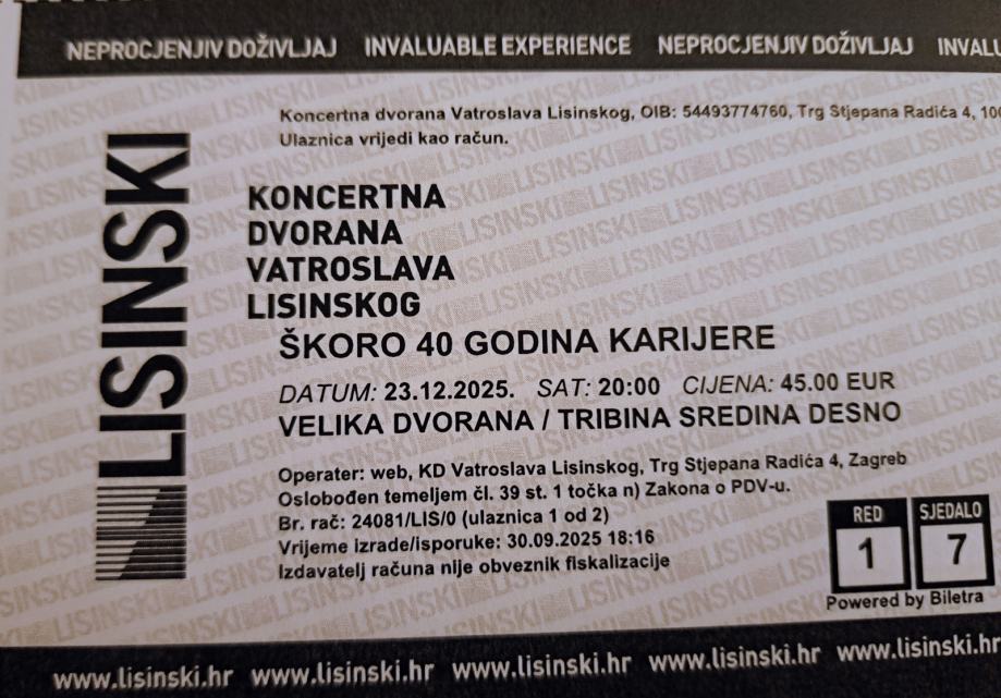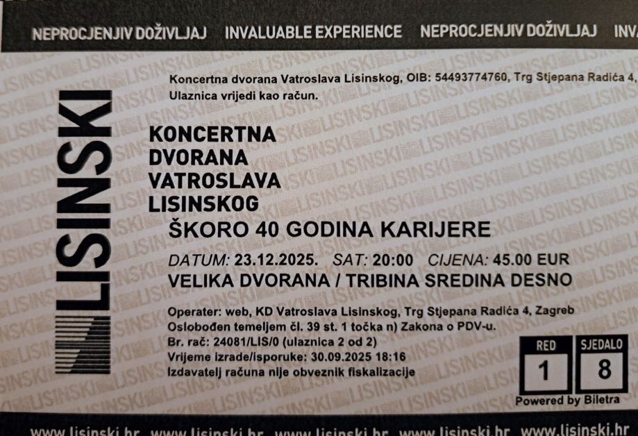 Prodajem 2 karte za koncert Škore u Lisinskom 23.12.2025 u 20 sati