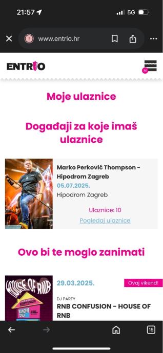 Prodajem karte za Thompsona 5.7 PARTER…karte su kupljene online i bit ce poslane nakon uplate novca na vas email!!