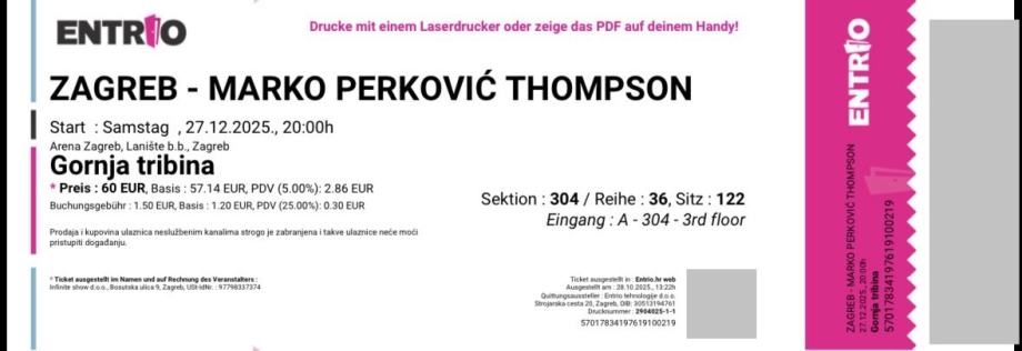 Prodajem kartu za Marko Perković Thompson – Arena Zagreb 27.12.2025