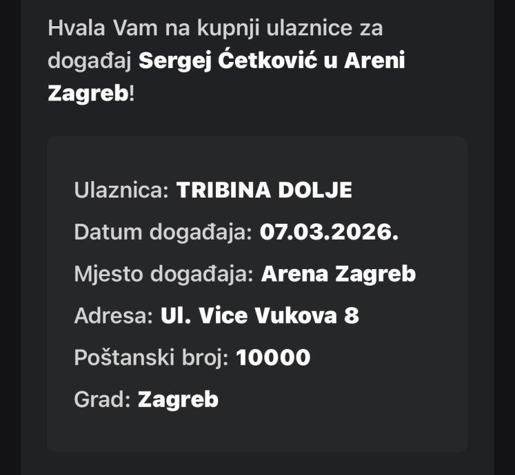 Prodajem 2 karte za subotu 7.3.2026 u Areni Zagreb