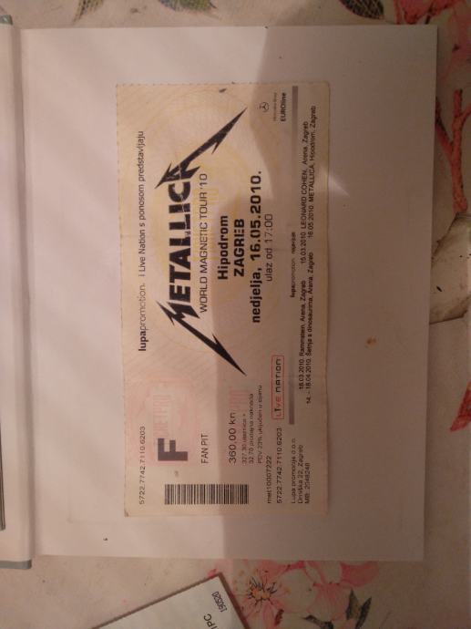 Prodajem staru ulaznicu sa kocerta Metallice u Zagrebu 16.05 2010g u dobrom stanju. Plačanje na račun ili gotovina.