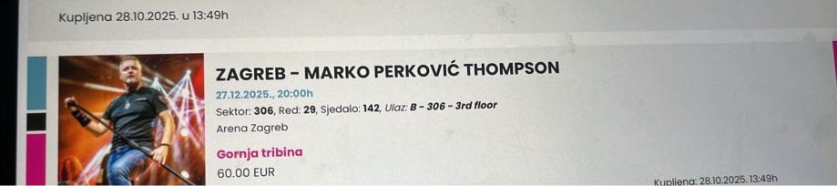 Jedna ulaznica za Thompsonov koncert u Areni Zg 27.12.2026