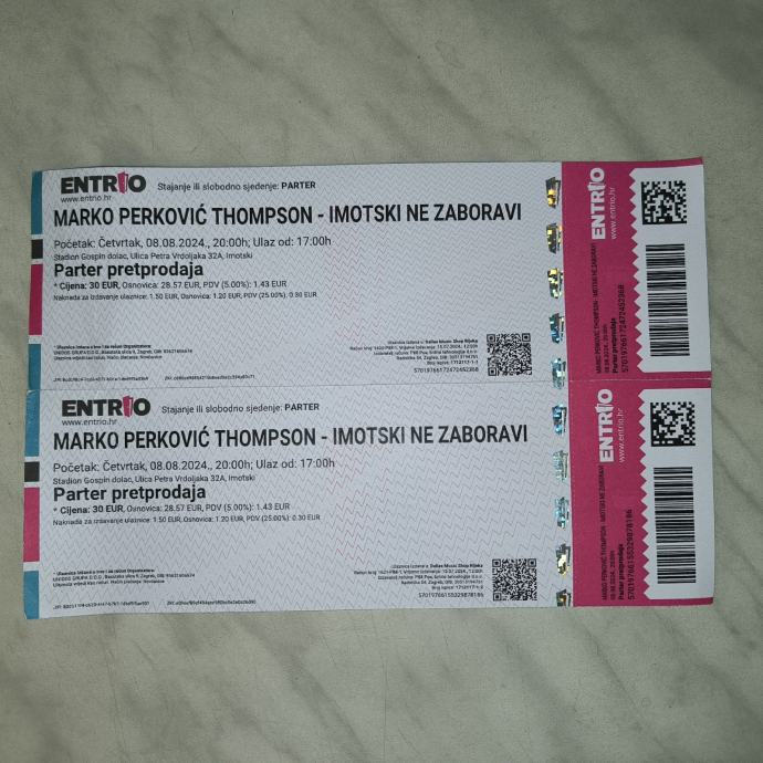 Prodajem dvije ulaznice za parter za Thompsonom koncert - četvrtak, 08.08.2024. za 70,00 Eura.