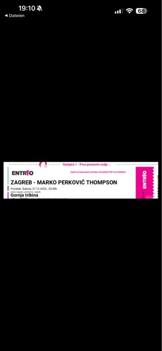 Prodaje se 1 Karta za Thompson koncert u Areni Zagreb 27.12.25. Sektor 308 / gornja tribina. Preuzimanje digitalne Karte preko WhatsApp / e-maila ili osobno u Kloštar-Ivanic
