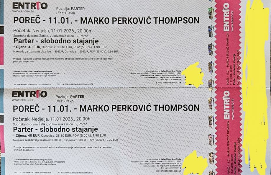 Prodajem dvije ulaznice za Thompsonov koncert u Poreču 11.01.2026.