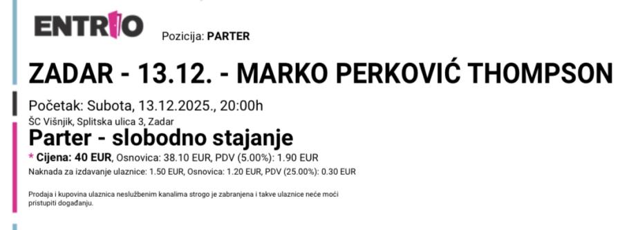 Prodajem jednu ulaznicu za parter u Zadru 13.12.