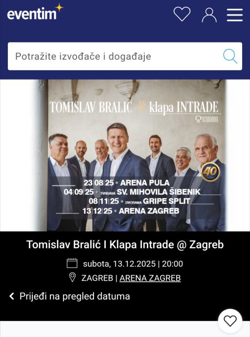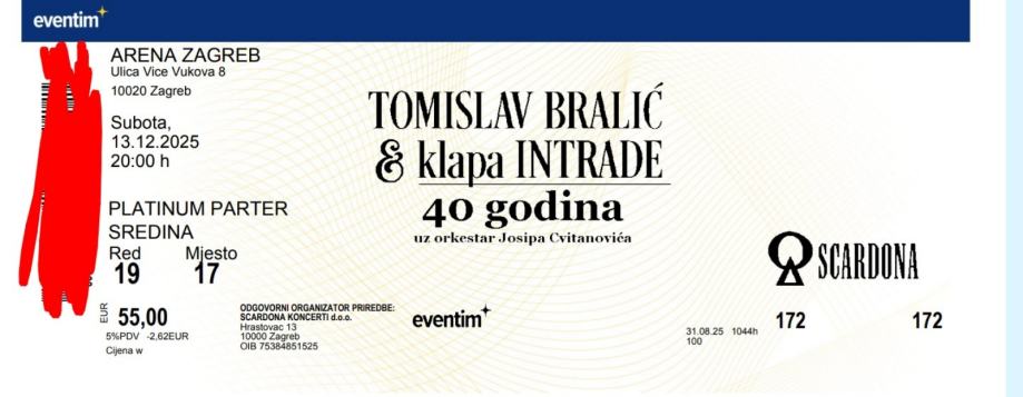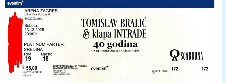 Zbog iznenadne spriječenosti, prodajem dvije karte za sutrašnji koncert Tomislava Bralića i klape Intrade u Areni Zagreb.