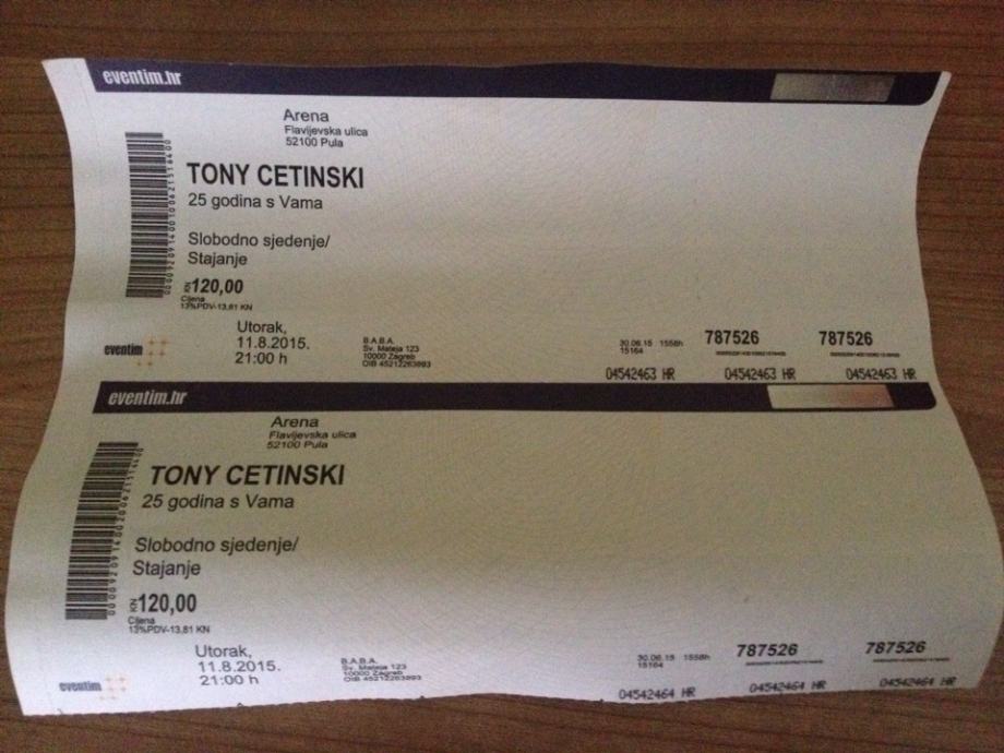 prodajem dvije karte (100kn/kom) za koncert Tony Cetinski 25 godina s Vama, Arena Pula 11.08.2015.